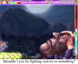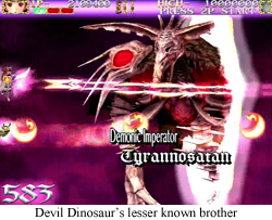 • Tell me a story: Oh yeah, there is an actual plot to this game. Random teenage girls got teleported to a magical, semi-medieval wonderland where every damn thing is trying to kill them all the time, so they became witches that vaporize bitches. There’s also another witch girl that wound up in the Deathsmiles universe because of a car accident, and her father has decided to go completely insane. He’s apparently responsible for summoning all the monsters because he thinks it’s the way home, but it turns out he’s only summoning Tyrannosatan instead. Dad gets devoured, everyone else gets to become friends. I think that was the plot of a My Little Pony episode.
