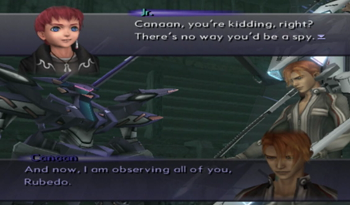 Canaan should have been a main character. If he were actually “always there, observing”, it would mean a lot more to hear about his eternal spy status. As it is, though, he’s a guest in the party for a couple of key scenes, but he’s entirely missing for some of the bigger events (he didn’t bother with the time travel adventure, for instance). And when Canaan is around, it’s not like he particularly does anything. After his (admittedly promising) introduction in XS2, Canaan basically joins the party as a sentient USB drive, and when Jin pries the data out of his noggin, it’s the revelations of the data that takes center stage, not the guy that is finally unburdened by it. Then, in XS3, Canaan is revealed to be working with Shion, Scientia, and Miyuki… which basically paints him as the random go-fer of the good guys. That isn’t an all-seeing spy that has been bugging the party for years, that’s practically Allen.