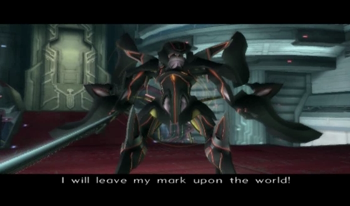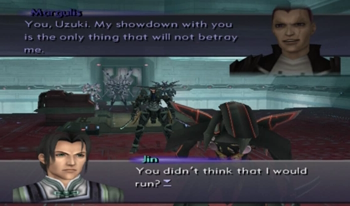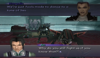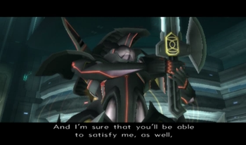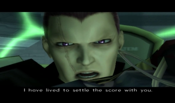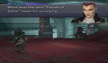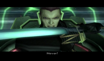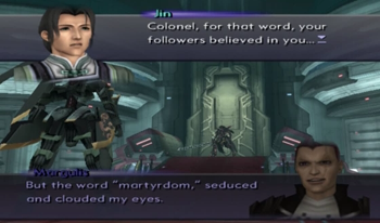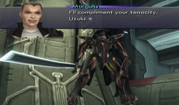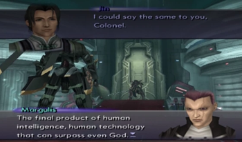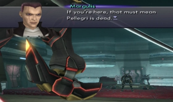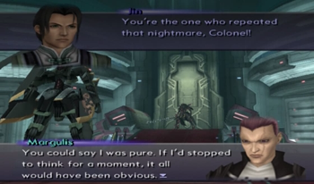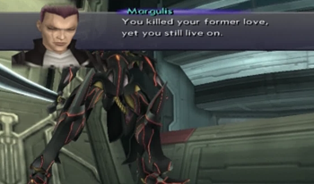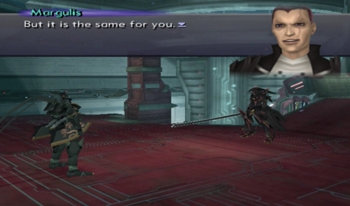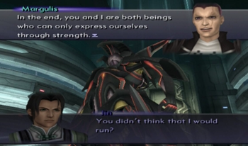 Margulis is actually an abnormality in the Xenosaga cast: he gets more interesting in his final 15 minutes of fame. As has been pointed out repeatedly, a number of XS characters started with complex backstories that either came to nothing (Mary & Shelley, Yuriev) or finished well before the actual final game (Ziggy, MOMO). Margulis bucks the trend by being introduced as a generic kind of menacing boss character, and then spending 2.5 games sulking around and tormenting the party (okay, mostly just Jin). Finally, in his last featured appearances, he finds out that his entire life’s philosophy is a lie, and actually displays a few more dimensions than “clearly a sub boss”. (I mean, seriously, did anyone ever think Margulis would be the last man standing? Dude screams “underling” more than Richard and Hermann.)