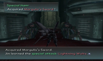 After the battle, you may find Margulis’s ejected sword stuck in the floor. This unlocks Jin’s final special attack, Lightning Waltz, one of two special attacks that are learned through an “event” (the rest are just level ups). Note that Pellegri’s signature element was lightning (Jin is ice, Margulis was fire), so Jin is honoring her memory. D’aww.