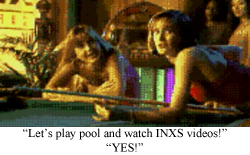 INXS: Make My Video is a whole lotta “movie” before you get to the actual game (“game”). The premise is that two women are playing pool in a crowded bar, and four separate factions want to sleep with these women, or play pool, or maybe play pool while sleeping with these women. I don’t know, it’s a very complicated plot. But the two women (apparently named Layla and Joey) aren’t going to give up their pool or panties until someone creates “the ultimate INXS music video”. This might sound like some kind of “when pigs fly” esoteric wordplay, but, no, they honestly want the best INXS music video, and they want it now. So you, player, must listen to each of the random want-to-have-pool-sex factions, follow their instructions, and then make a flawless INXS music video.