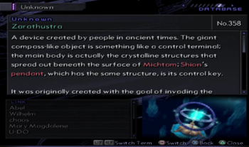Zarathustra is a device built in Biblical times. It was apparently designed by Mary Magdalene, though, considering her reincarnated role, it’s assumed Ancient Shion had a hand in it, too. The idea was that Zarathustra was a device to reach up and poke the eye of God, because Mary was not coping with the death of Jesus well. Unfortunately, according to Wilhelm, if it did ever get used, God would get pissed off and destroy the universe. No reboot, just all of existence destroyed. Mary and Ancient Shion didn’t live to activate Zarathustra, so, in the meanwhile, Wilhelm modified the device to reboot the universe, not destroy it. Shion’s Pendant is apparently the lynchpin for the reboot-not-destroy function.