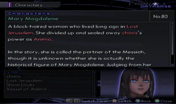 First of all, we were already low on Biblical women, so the idea of “The Maiden of Mary Magdalene” is entirely an invention of Xenosaga, although it could be partially based on how the Bible admits that Mary had other friends. Just don’t expect to find any ancient etchings of “that woman that hung out with Mary Magdalene”.