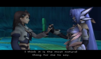 Now whether you want to interpret this as “Mary was bi, and they were totally doing it” or “they were really good gal pals” is up to you. Frankly, there’s evidence for either interpretation. While XS1 was pretty good about portraying Shion and KOS-MOS as an adult mother and daughter (Shion is mom, and KOS-MOS occasionally misbehaves, but she also turns around and saves the day in equal measure), even from the beginning, there seemed to be a lot of… physical intimacy going on. After a whole lot of hugging and “you’re the only one that understands me”, the final scene between Shion and KOS-MOS is of two people with their hands clasped around each other’s fingers, wishing each other heartfelt good-byes and promising to see each other again. If these two were traditionally complimentary genders, there’d be absolutely no ambiguity there. Though, again, a lot of XS3 portrays a parent/child relationship between Shion and her daughter who is gradually learning to discover her true self.