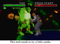 Big ol' bellyAnd I think that’s the moral here. War Gods was lauded as a graphically amazing game at its release, but it was also quickly forgotten and forsaken for practically every other fighting game available at the time. When Mortal Kombat 4 was released, it aped War Gods’ “3-D” dynamics, and, even though practically nothing was changed between the two releases, Midway somehow expected MK4 to do better. It didn’t. Mortal Kombat 4 crashed and burned as badly as War Gods, and, when Mortal Kombat “came back” a generation later with Mortal Kombat: Deadly Alliance, it barely resembled Mortal Kombat at all. War Gods could have been a fun experiment to test what would work for Mortal Kombat in the 3-D world, but it wound up being a lame copy that was then lamely copied to the “real” franchise.