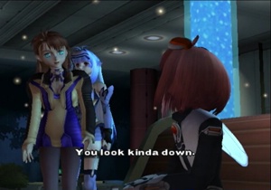 But this isn’t to suggest Shion and Allen are a simple “gender swap” of the typical hero/pining crush setup. Shion definitely displays typically feminine traits. KOS-MOS is here to be that “strong female character” that could easily be “write this character like a male action hero, but, ya know, with boobs”. Shion seems to take a female approach to things, and contrasts greatly with Junior, the “male lead” character that is only occasionally the lead. Junior thinks the only way to stop Albedo is through a bullet to the brain, Shion reacts like a woman (that is to say, an actual God damn human, as opposed to the “rational” male ideal) and is stressed at the mere thought of brother literally having to fight brother. And, while we don’t see it much past Episode 1 (which had the luxury of a “slow” plot), Shion does do her best to console fellow party members after harrowing experiences, like when MOMO first hears her dad might be an insane lunatic.