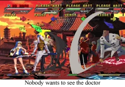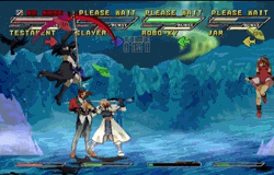 Guilty Gear Isuka should have been a thing of beauty. The previous Guilty Gears were great, enjoyable 2-D fighting games in an era when the 2-D fighter seemed to be all but dead. Capcom was resting, Mortal Kombat was dead or totally 3-D (or both), and, sadly, no one took up the torch of Eternal Champions. But Sammy did their best to keep the fires of 2-D combat going, and, over approximately 60 incremental releases, Guilty Gear had become an excellent source of 2-D fighting fun. And there was a pretty large roster of 20 or so playable characters, so let’s do something new and innovative with the 2-D genre. People like Smash Bros. and Marvel vs. Capcom’s four player mode, right? Let’s take the preexisting Guilty Gear architecture, and make a 1-v-1 into a four player free-for-all! All the characters and moves you love, but now featured in a brand new, completely hectic battle royale. Chaos is the new normal!