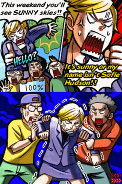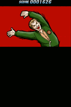 EBA is, superficially, a fun game. It’s the story of the eponymous Elite Beat Agents, a trio of fine looking men who appear when people are in trouble and in desperate need of someone singing Madonna covers. The story of the game is told through fun little comic book panels and “skits” that portray stressed individuals eventually gaining the power to conquer their fears with the help of the spirit of David Bowie. As a side effect of this generally senseless plot, most of the stages place tongue firmly in cheek, and, while I don’t really believe a stage magician could thwart a casino robbery with magic doves and a pet lion, it is entertaining to play along. Couple this with some of the finest hits of the aughts (Avril Lavigne! Sum 41! Ashlee Simpson! … Hoobastank?), and Elite Beat Agents should be an all-around fun experience. Who doesn’t like tapping their DS along to Jamiroquai?