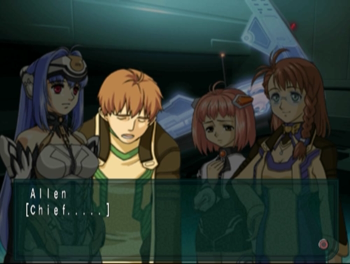 But the game starts on the Elsa with Allen, Shion, MOMO, and KOS-MOS hanging out. Note that even though this game was released after XS2, the general timeframe (and fashion) seems to be based on XS1. I mean, it’s a crossover game, it’s all non-canon and whatnot, but just something to note.