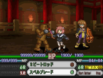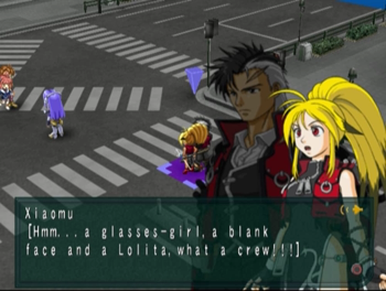 The rest of the party also hues pretty closely to the Xenosaga character templates: Dunban is Jin and Ziggy rolled into one. Mela is our stock “young girl” that is way too smart and far too responsible. Reyn believes he’s an action hero from a totally different genre (but is still generally reliable). Sharla feels kind of original, because it’s not like there’s anyone in Xenosaga that is motherly, concerned with helping people, and is pining after a lost love. Riki the Heropon is clearly what would happen if Bunnie AI escaped and ran up a significant grocery bill.