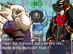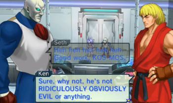 But we find KOS-MOS (v4) immediately afterwards. Turns out she was working as a tour guide for Street Fighter’s Seth. Come on, KOS-MOS, you should know better than this. It’s not like he’s ridiculously, obviously evil or anything.