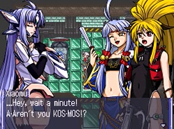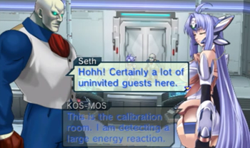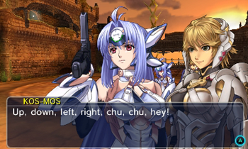 This time, they actually try to wedge the crossover into an actual bit of continuity. Technically, KOS-MOS is visiting SRTOGSEF after T-elos destroyed her on the Floating Continent, but before she reawakened to defeat Black Testament. It’s… kinda canon?
