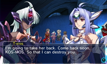And KOS-MOS and T-elos become allies. That’s right, T-elos is a playable character in this one!