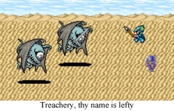 So we’re back to lefty equals evil? Wow, how progressive, Square. How about Final Fantasy 4: The After Years? That game introduced about 10,000 new, original, useless characters whom we must pilfer, anybody new to the playable cast a lefty? Yep! We’ve got… Golbez. The other guy that spent all of Final Fantasy 4 trying to destroy the world. Boo, Final Fantasy 4. Boo.