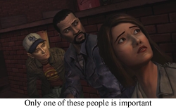 Come to think of it, there’s a lot that is miraculous about Telltale Games’ The Walking Dead. For one thing, it’s either an “old school” adventure game or a slightly graduated visual novel, and both of those genres have absolutely no business being interesting. Don’t get me wrong, I loved King’s Quest V as much as the next guy, but the whole “adventure game” mold is basically based on making interesting stories with unique ways to interact with the environment before videogames really had the power to do it “right”. And take a look at the number of transitory, wannabe adventure games for examples on the real reason that genre never went anywhere. Oh, and visual novels? Not even going to address why those are terrible. Basically, it’s amazing that The Walking Dead was able to properly synthesize an excellent game out of these basic pieces, left alone the whole zombie problem.