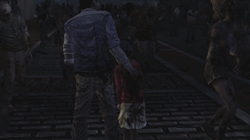 But the adventure game motif comingling with the escort mission works brilliantly for the undead hordes. Lee is, at best, equipped with a cumbersome axe, and he is never going to be granted a rocket launcher. It’s clear from the first episode that the most “physical” Lee is ever going to get is reeeeeeally reaching for a key, so don’t expect any crazy zombie jump kicks during this adventure. Ultimately, this all adds up to maintaining the zombies as a constant threat, and then ups the ante by giving the player someone to protect. I’m not worried about Lee dying, after all, he’s a videogame protagonist, any of his deaths will be undone by a quick “Press X the restart”; but Clementine? If something happens to her… well… that would be horrible. I’d give my left arm to guarantee Clementine’s safety!