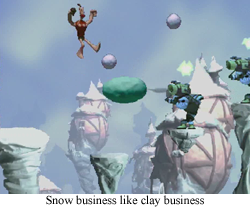 Skullmonkeys is a platforming game, plain and simple. You run, you jump, you jump on enemies, you spend a lot of time waiting for moving platforms, you’re dead in one hit unless you grab a powerup that allows for two hits, and there are a few “fireball” bits of ammo scattered around for when jumping just won’t do it. There’s a simple progression of difficulty and an increasing number of “traps” as Klaymen ventures through Idznak. There are bosses with simple, repeating patterns. There are bonus stages available only through finding various hidden knickknacks. It’s a platforming game, and if you switched in Bubsy or Awesome Possum for Klaymen, nobody would blink an eye. … Well, aside from the general confusion that would arise from playing a Bubsy game that was actually good.