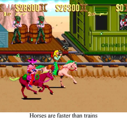 Here we goSunset Riders is a pretty standard Western videogame. Actually, that’s a little bit wrong, as I’m pretty sure the average Western doesn’t contain this much neon. Also, Native Americans in this Konami action game are Native Ninja. But conceptually this is a standard Western: three (nearly identical) bounty hunters and their Mexican stereotype sidekick are looking to make a few bucks, and, on the way to bigger and bigger bounties, wind up saving fair maidens and one-horse towns. There’s some cattle rustling, horseback riding, and saloons out the wazoo, so there’s no question about the Western-authenticity of Sunset Riders. Yes, the game leans on goofy whenever possible (I’m pretty sure running atop a stampede is something out of a Charlie Chaplin routine), but, glowing bullets or no, this is still a bloody Western. I’m not one for counting, but I’m pretty sure Sunset Rider Bob (clearly the best named hero of the bunch) mowed down about 12,000 gunslingers between here and the Rio Grande. They… uh… let’s assume they all shot first.