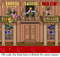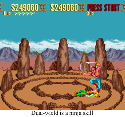 • Ninja!Favorite Boss: Chief Scalpem/Wigwam is the weirdest kind of racist. He’s a Native American “savage” like you’d cringingly expect to see in your average Western, but in this case, “savage” equals “ninja”, so he flies around like Rolento tossing knives all over the place. I am not familiar with that particular stereotype.