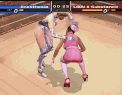 It also might just be an homage to one of the most annoying bosses in 3-D fighting history, Virtua Fighter’s Dural, who also happens to be a robot/cyborg/something or other woman. And Virtua Fighter is one of the most serious fighting game franchises out there. If you’ve got a legit mecha-lady conquering that tournament, what’s wrong with seeing the same thing in Rumble Roses? It’s just a convention of the genre, nothing more to it.