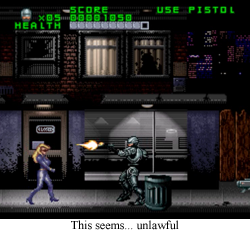 Is it even possible to improve on the destructive power of that old standby? (Please don’t tell me the answer to that, I’d prefer to sleep at night.) This all comes to a natural conclusion in “the vehicle stage”, wherein Robocop is piloting a futuristic (maybe) flying thing, and the goal of the level is to destroy twenty terminators before moving on. Can they really be called terminators anymore at that point, though? Aren’t they more… target practice?