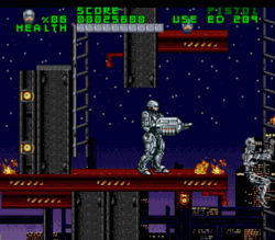 But the problem isn’t that Virgin Games involved a terminator, it’s that they went for terminators. Terminators leave their lovely dystopia to visit Detroit’s slightly less futuristic dystopia, and the mechanical malcontents descend upon Robocop. One Terminator is encountered at a construction site, and, with the right positioning, it can be defeated without Robocop even having to move. But the next terminator is slightly more invincible! He can’t be defeated with simple armaments… but there is a pretty conspicuous pit nearby, and you know what you have to do. The next terminator is similarly doomed, but his death is slightly further away. And then Robocop takes the long way to a future full of terminators.