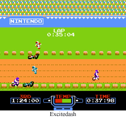 Excitebike is a racing game featuring the player scooting along on his little (excite) motorcycle. Like any racing game, the goal is to get to the finish line in the shortest time possible. Like its spiritual descendant, Uniracers, Excitebike is stuck in a 2-D plane, so “racing” is nothing like modern 3-D affairs. Basically, your job is to steer your racer around and over obstacles, and carefully gauge your engine’s temperature. Keep cool metaphorically and literally, and you’ll come out on top. Fail to properly right your cycle or overheat your engine, and, well, kiss the checkered flag good-bye. It’s one of those “basic” early Nintendo games that is pretty straightforward in a one paragraph description, but can be difficult to get right every time during the heat of the race. Or you can just watch Excitebiker roll around like a tumbleweed, and get your jollies from the suffering of pixel people.