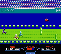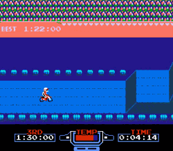 Obvious perversions aside, though, there are a few things that separate Excitebike from the typical “racing genre” fair. For one thing, there isn’t really a “grand prix” as we know it, and, aside from saved (temporarily) “best times”, there isn’t any real progression in the game (or, to be more precise, you don’t lose any progression after placing 30th). And the other big, confusing change for anyone used to typical racing games: there is no such thing as a “place”. Whether there are other racers on the track or you’re just by your lonesome, all that matters is your final time, and you may place “first” even if you saw a bunch of other losers cross the finish line ahead of you. Speed is king, the end.