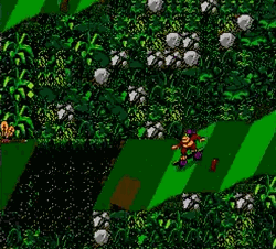 Technically (and only technically) Thrilla has a lifebar. However, those extra hits are not going to do the guerilla any good, as the most common obstacles are instant-death logs, rocks, and bottomless pits. And every death guarantees a one-way trip back to the start of the stage, progress be damned. While you can slow down to avoid many traps, Thrilla has a need for speed, and that “need” is a necessity because those bottomless pits are long and numerous. In short, this makes nearly every a stage a memorization challenge on par with Battletoad’s Turbo Tunnel. And at least the Turbo Tunnel had checkpoints! Every mistake here is an excuse to start the stage over again, and, should you miss a single jump, you know what you have to do all over again.