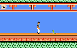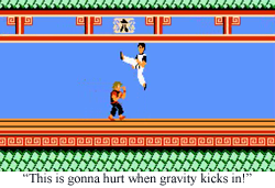 That’s it! That’s all a Kung-Fu jump does. There are no ladders to climb. There are no doors to enter. Even vaulting over an enemy is less satisfying than simply kicking that creeping snake right in the asp. The jump of Kung-Fu is there for one reason and one reason only: it is another avenue of attack. The best defense is a good offense, so the best way to avoid a million encroaching dudes is to distribute a million deadly punches. If that doesn’t work, leap over the incoming attack, and, hi-yah, jump kick to the face. Who needs “environmental hazards” when you’ve got dudes tossing friggin’ knives!?