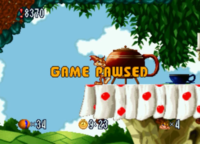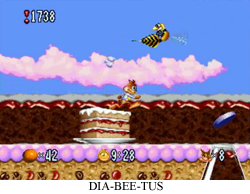 Bubsy in Fractured Furry Tales does absolutely nothing to alleviate these Bubsy problems. Stage design is still an incomprehensible mess, enemies still murder Bubsy in instantaneous and inexplicable ways, and Bubsy is still tasked with platforming challenges that require catlike reflexes… while Bubsy is still stuck with a jump that can best be described as “hippo-esque”. In fact, it’s somehow even worse in BiFFT (man, even the acronym for this game sounds like a fart), as there are a great many situations where Bubsy is forced to make blind jumps straight into spikes, lakes, and the occasional boiling chocolate pit. Maybe that’s Bubsy’s greatest weakness? Monsters and hazards scroll onto the screen way too late to be avoided, and, coupled with Bubsy’s complete lack of health points (and no possible way to collect more health), we’ve got a lot of dead Bubsys lying around. Speaking of a complete lack of powerups, all of the “innovations” of Bubsy 2 are gone here, so no nerf blasters for you. Just jumping! Always jumping!
