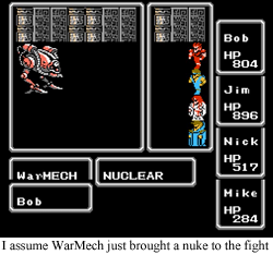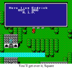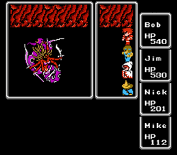 • ELVES!What’s in a name: Since I knew all the stats and whatnot going in, I was careful to name my Final Fantasy characters according to their specialties. Fighter was Bob, because I’m the leader, duh. Black Belt was Jon, for one of my friends that was a fan of karate, and White Mage was Mike, one of my more helpful friends. My best friend, Jim, was granted Black Mage, because I knew he would learn the most powerful offensive spell in the game. However, the real life Jimmy was upset, because he wanted to be the “cool” Black Belt. I… I didn’t have the heart to tell him that a ninja was available. Anyway, I did correct those problems for this playthrough.