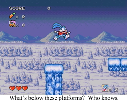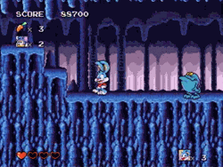 Buster of Tiny Toon Adventures: Buster’s Hidden Treasure tries to emulate the Sonic “gotta go fast” formula, but with basic hit points. On one hand, yes, it would have been a little too obvious if Buster collected trails of “carrots” and had to maintain a single veggie to avoid death at all times, but… that would have been so much better. Buster has 3 HP, which means the game always flows like this: