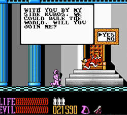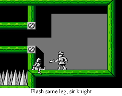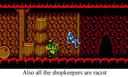 There are three main areas to Wizards and Warriors 3 (huh, wonder if that was deliberate): the castle, the town, and the underground. Kuros also has three corresponding forms: knight, thief, and wizard. If you remember to always wear the appropriate disguise in the right area, you won’t have to fight a single random “monster”. Okay, that isn’t exactly true, as there are these floaty green dudes in the underground that will kill just about anybody, and there are a few birds that are absolute dicks, but other than that, the game pretty much plays by the rules. This means that, despite Knight Kuros’s kickass flying axe, you pretty much never need to use any combat skills in W&W3.