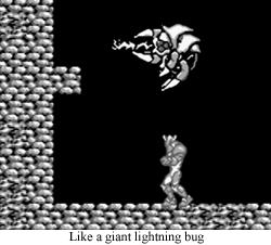 The gamma metroid even learned a new trick: it can generate and distribute electricity! This is amazing, as metroid physiology previously only allowed for the absorption of energy, and it seemed that all the excess power was spent on the metroid’s strange floating ability. But the gamma metroid has extra power, and he/she knows how to use it! Lightning bolts fly from the gamma’s fangs, igniting the dark caverns of SR388 with every burst. Could gamma metroids be deliberately illuminating these passages for the benefit of their fellow SR388 inhabitants? That seems like the most apparent answer.