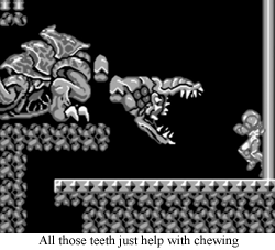Look at the widdle tailAnd thus must the zeta inevitably become the omega, the final form of the humble metroid (usually). The omega metroid is basically a miniature tyrannosaurus. And that’s good! Who among us hasn’t ever desired a pet dinosaur? The omega metroid, not unlike a mastiff or a great dane, would be the perfect oversized companion for any schoolchild. Aw, look at that omega, it even looks like it’s wearing an pleasant little backpack. Wouldn’t you be happy to see Lil’ Timmy walking down the street with Lil’ ‘Meggy Metroid? Just be sure to clean up the sidewalk before that acidic drool seeps into the water supply.