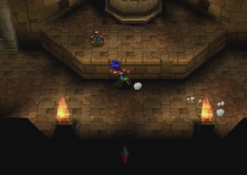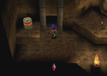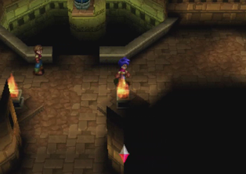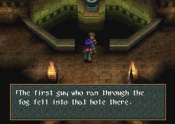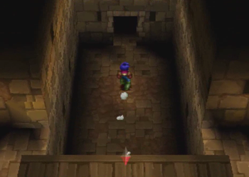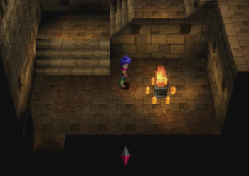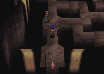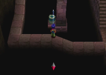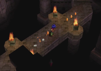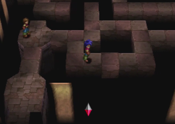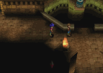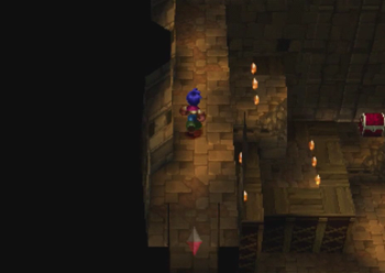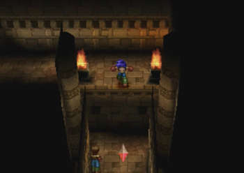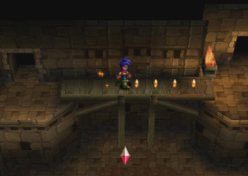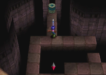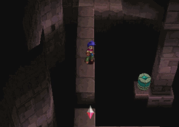 Now we can really start our dungeon exploring. The next area has a high and low branch. The basic idea is that you may fall from the high area, and then have to retrace your steps through the low area… but since the low area is a dead end, you might accidentally choose the low branch first and waste some time. I hate wasting time!