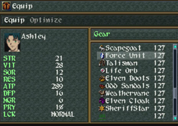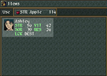 Incidentally, SOR is Sorcery, for magic power. VIT is Vitality, aka defense. And RES is Resistance, basically your magic defense. LCK is your lick stat, which measure how effectively Ashley can taste the rainbow.