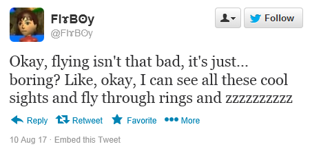 Pilotwings SNES is a neat tech demo, but I don’t really like how the game controls. Skydiving through some rings and parachuting onto a jump pad should not be that difficult! The 3DS is better, but yeah, it’s pretty boring.