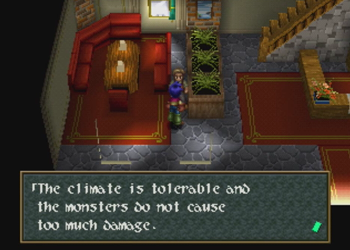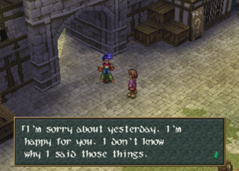 It’s also unfortunate that this “killjoy” thing winds up being the label for one of the absolute few sincere relationships in a JRPG… uh… ever. Most JRPGs go for the action movie cliché of “these two characters have been fighting together for a few hours, and they have complimentary genitals, so they’re in love now”. Either that, or the rare “they were married before this game started, kiss kiss, off to kill monsters now, dear” thing. Wild Arms 2 does its best to actually develop the relationship between Marina and Ashley over the course of the game, and it’s never because the two characters thump monsters together. This ain’t Romeo and Juliet, but it’s at least more believable than Zidane and Dagger (and please let this paragraph inspire a Greatest Romances in Gaming thunderdome).