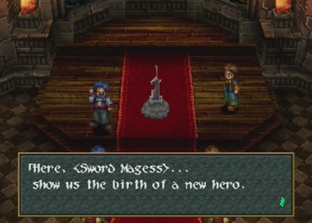 Pretty standard story here: The Blaze of Disaster showed up, wrecked the place, and then The Sword Magess appeared with her magical sword. Seven days later, she and the Blaze of Disaster both disappeared, and she left behind her sword in a stone.