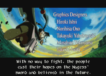 Winds up dislodging the opening credits. A gorgeous series of “slides” appear here with the credits explaining the story of The Sword Magess, basically WA2’s “ancient hero”. It’s a fun way to introduce the backstory and get the mandatory cinematic credits out of the way.