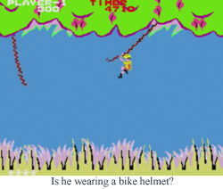 On its own, Jungle Hunt isn’t all that weird. It’s the story of some random explorer dude saving his woman (Wife? Girlfriend? …. Mom?) from cannibals, as one does. However, what’s worth noting here is that Jungle Hunt itself was originally intended to be a Tarzan game, but someone noticed that that dude in a loincloth swinging along vines miiiiiiight just infringe on a couple of copyrights. So the noble Tarzan became Sir Dudley, and maybe a vine was transformed into a rope. And that’s it! Tooootally different, tooootally lawful.