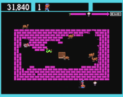 Again, we start with a pretty basic premise: Zeke is a zookeeper, and it’s your job to help Zeke keep all the animals penned up. However, someone decided to get some proto-Super Mario Galaxy action going, and Zeke…. orbits his zoo. And, somehow, as long as Zeke has his feet planted on the ground, the mere act of running will generate bricks (fences?) to trap rampaging lions. One would suppose this is some manner of “compensation” for the good old days of 80’s graphics, and the whole thing would be in 3-D if it were released today, but… It’s peculiar. Zeke’s zookeeper gravity is just plain weird, and gives the impression that Zeke’s Zoo is the literal center of his world. I… kind of feel bad for the poor guy. He’s not very good at his job, and it’s all he has.