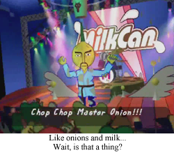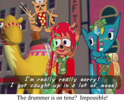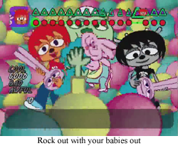 Legends of Localization: There was a period of about ten years when companies actually completely localized quirky Japanese games, voice acting and rhythm assignment and all… and then it ended. Now we’re stuck with Hatsune Miku making weird-ass noises, and we’re lucky if we get subtitles that marginally explain the lyrics. Oh well. At least we’ll always have PaRappa, Lammy, and Gitaroo-Man.- Required Statement: Stage 6 is a mysterious island in the American version, but is actually Hell in the Japanese and European versions. It is a strictly American belief that nobody likes to hear about their favorite heroine being sent to Hell after an incident with a banana peel, so it was changed for Western audiences. For whatever reason, this factoid must be stated every time Um Jammer Lammy is mentioned, so I’m just following the rules.