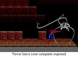 Initial Impression: Doc Ock is a pushover in this game. Literally! He’s balancing on his long, noodley octo-arms, and, a few jump kicks to the face later, he’ll be toppled over like a turtle. And then Spider-Man webs him up, and gets him to rat out every one of his cohorts. He’s a first level boss! With a bowl cut! He never had a chance.