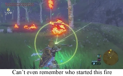Further Unanswered Questions: So, does Squeeze Box Bird know Link is, ya know, Link? Like, he’s apparently had the only known photo of Link and the Champions all this time, and… was he just humoring Link as “the traveler”, or was he dedicatedly helping the hero all this time? Or is the bird just Hylian-racist, and all these elf kids look the same to him? Kass, give us some info!- Favorite Exploit: You’ve only got one chunk of heart for the opening bits of Champion’s Ballad, but you do keep all of your equipment. And there is fireproof armor available, so maybe it wouldn’t be a bad idea to light Link ablaze and wreck up the place. Come to think of it, BoW Link is kind of an uncontrollable asshole. And now he’s got a motorcycle!