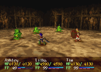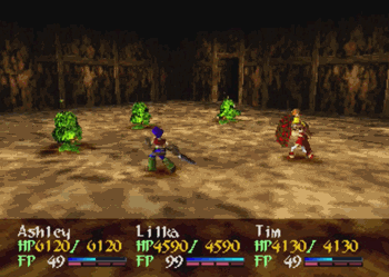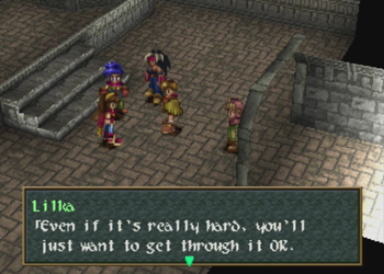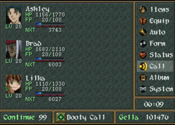 So everybody gets summon magic. Ashley, Lilka, and Brad now all can summon a guardian attack at Level 2, with the only caveat that the weakest member of the team with the lowest HP has to be in the party at the time. He doesn’t have to be alive, he just has to be there. In general, summons (combines?) will offer a great blast of damage, but they’re not always worth the 50 FP. Ashley is generally better off saving up for Access, Brad is more effective with his arms, and Lilka should conserve FP for spell use. All that said, they can be impressive area-effect attacks against random mobs, so they can come in handy.