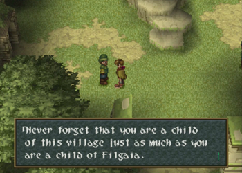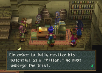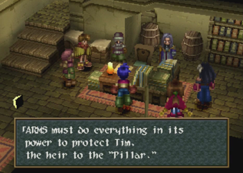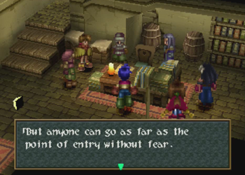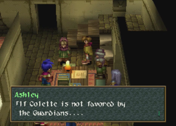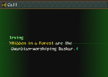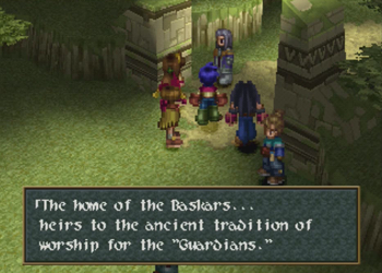 Baskar Village is a recurring location in the Wild Arms series. It managed to show up in all the titles (well, kinda, as Wild Arms 4 contains a “ruined” Baskar, and I don’t know about that TRPG), but it is not meant to be the exact same location. Kind of a Final Fantasy Cid-thing. Of note, Baskar is always a “spiritual” town, but in Wild Arms 1, it was distinctly anti-Guardian “usage”, and more into elves (elw) than gods. Here (and again in 3), Baskar is Guardian central.