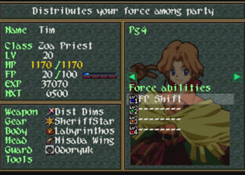Tim’s Level 1 Force Ability is FP shift. This will grant 25 FP to the other two party members for 25 of Tim’s FP. In general, Tim is a mage, so losing FP (magic fuel) for the sake of other party members is a bad idea, but it can come in handy when you absolutely need to top off Ashley.